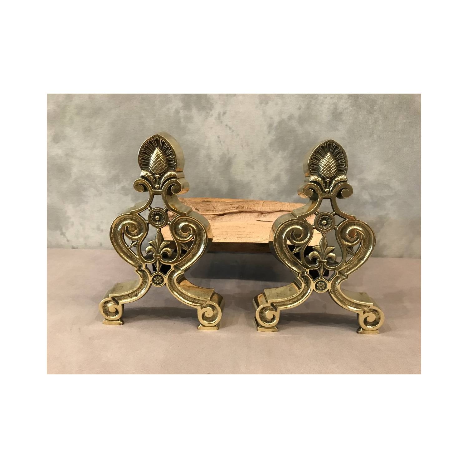 Jolie pair of bronze and brass chenets entirely polished from time to 1900, with a decoration of a fleur-de-lis and a pine apple.
