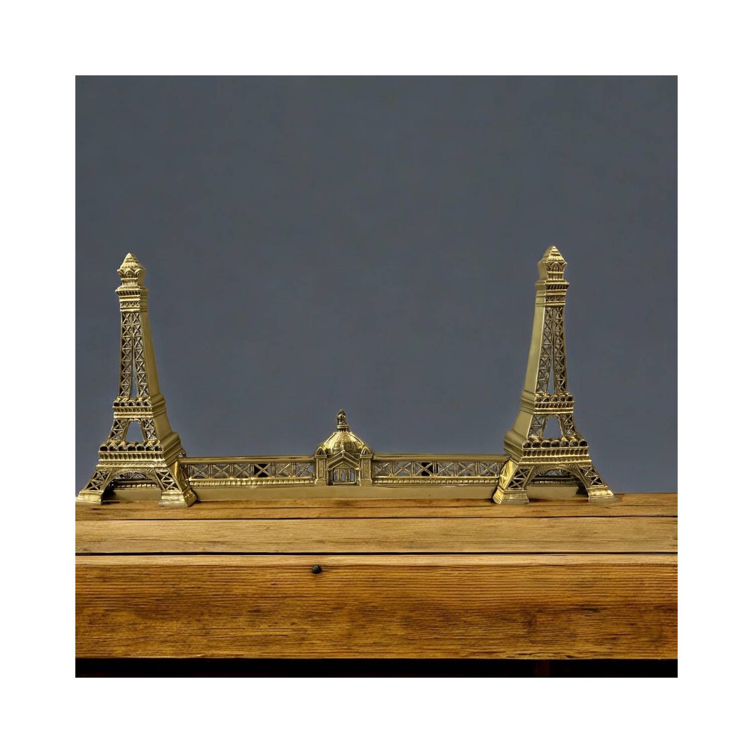 Beautiful hearth bar, fully polished and varnished bronze fireplace bar, with decorations of the Eiffel Tower and the Trocadero palace in the center. It dates from the time around 1900.