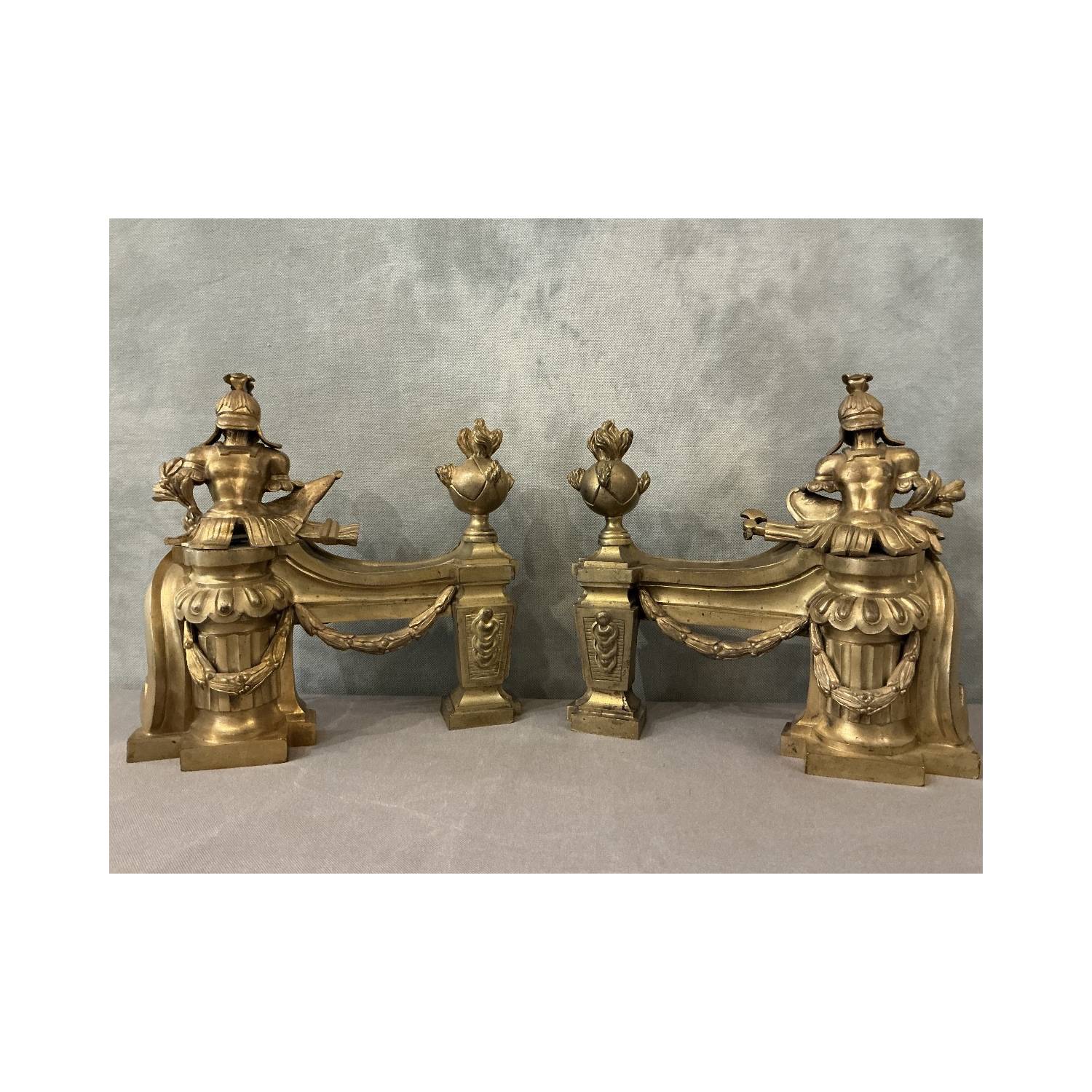 Paire de chenets en bronze doré d'époque fin 18 ème