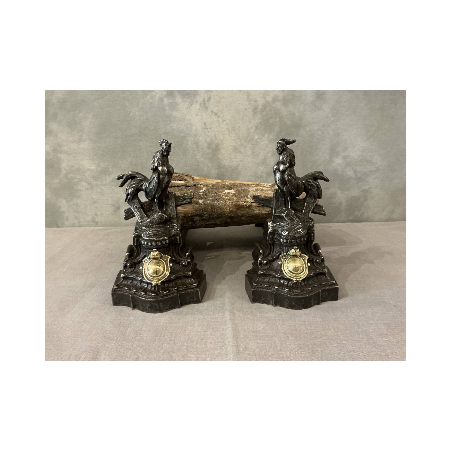Paire de chenets anciens en fonte et bronze d'époque 19 ème aux coqs