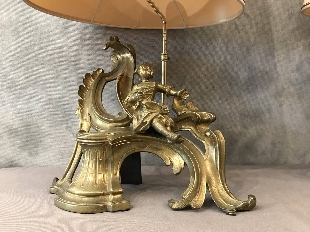 Pair of gilt bronze andirons period 19th Louis XV style Napoleon III, mounted lamp with lampshade very sober and elegant. The andirons are gilded bronze representing characters, a man holding in his hand a basket of fruits and a woman holding her dress. Height with lampshade: 58 cm