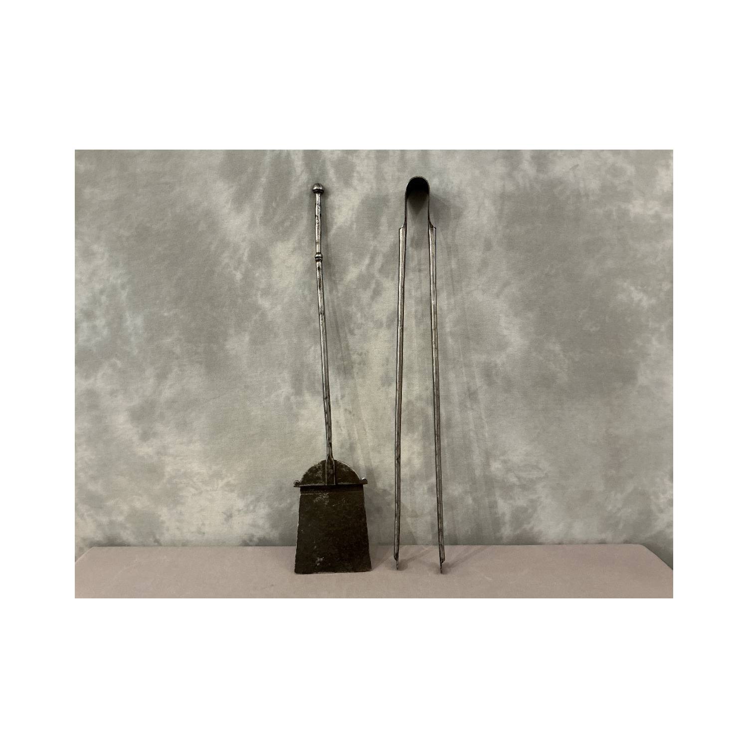 Grand ensemble d'une pelle et d'une pince de cheminée en fer forgé d'époque 18 ème