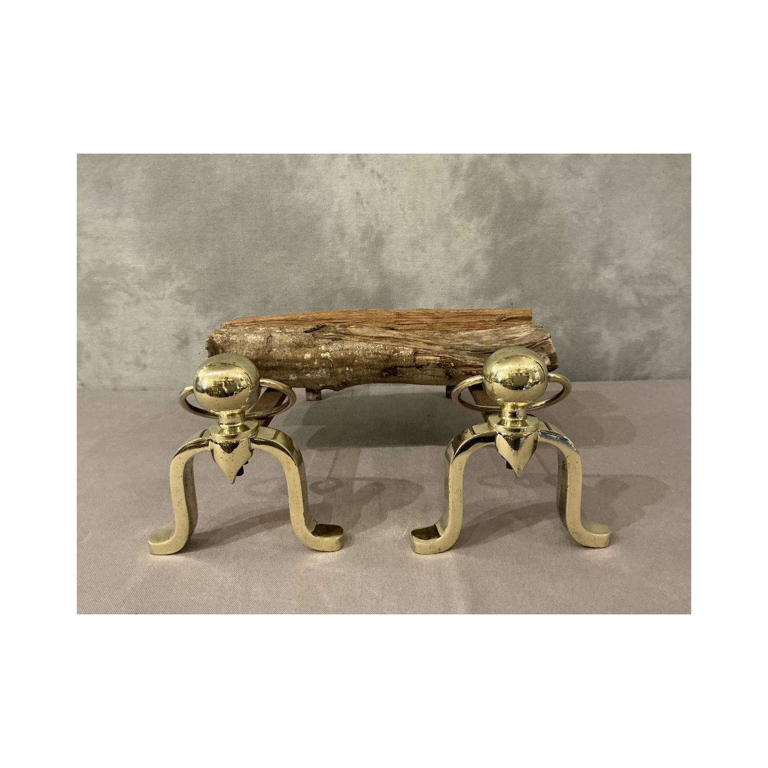 Paire de chenets anciens en laiton vers 1970, modèle sobres de pieds surmonté d'une boule supportant un anneau pivotant.Dimensions largeur 15 cm hauteur 8,5/15,5 cm profondeur 34 cm
