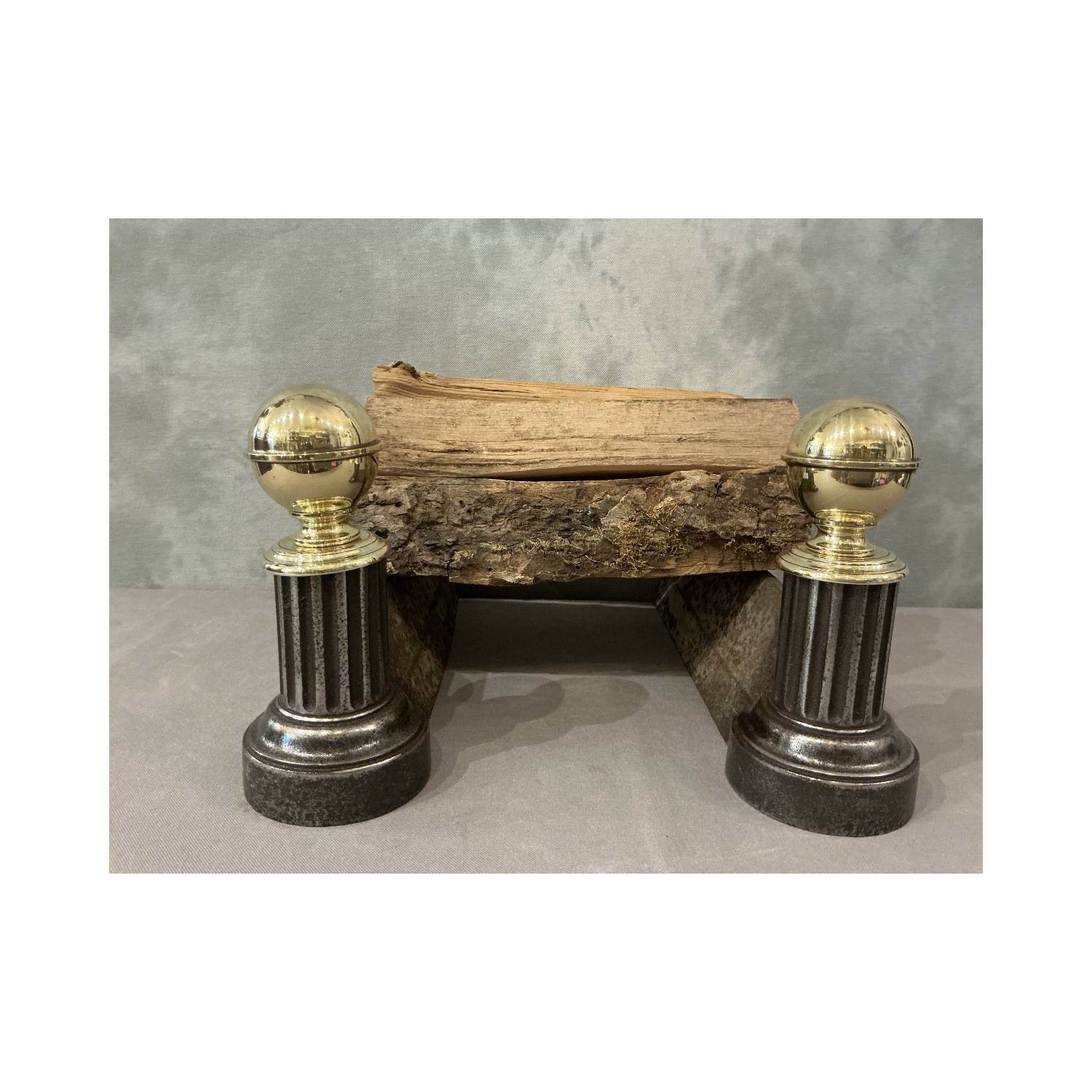 Paire de chenets anciens en fonte et laiton d'époque 19 ème, modèle avec boules.