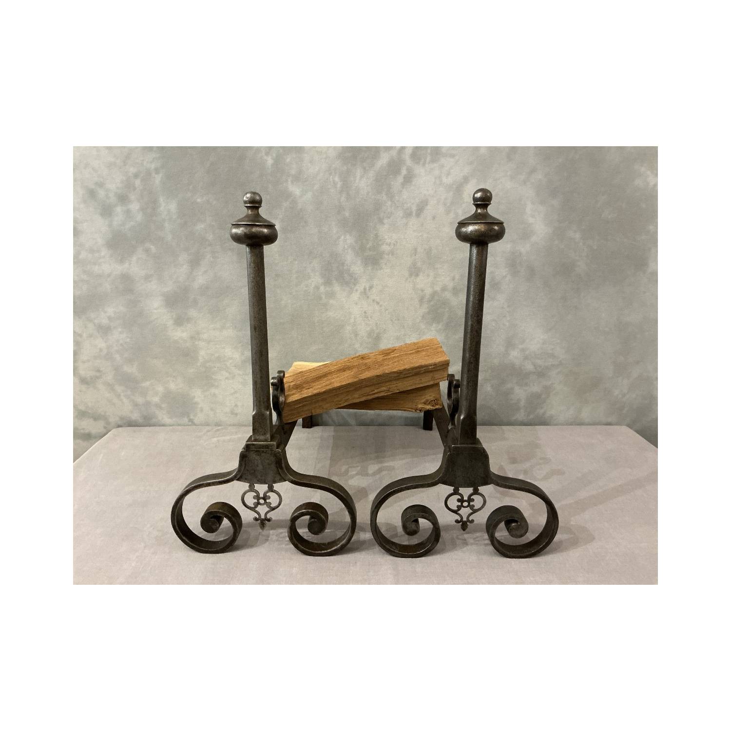 Paire de chenets en fer forgé d'époque fin 18 ème , modèle à enroulements de pieds vers l'intérieur avec un travail de fer entre les pieds.