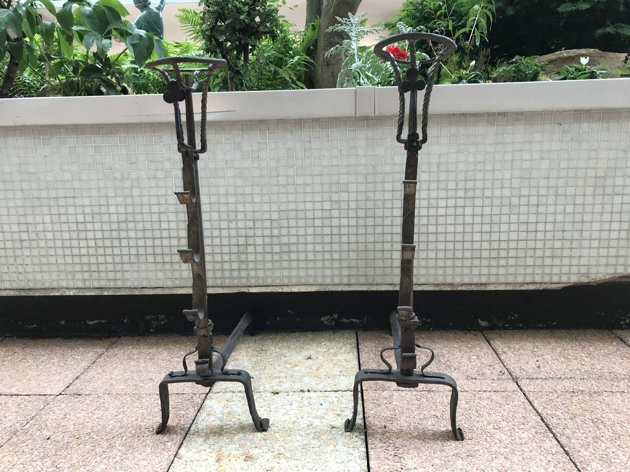 Grand chenets en fer forgé rustique modèle aux Landiers d’ époque 17ème , beaux piétements avec joli travail de fer, une barre de crochets se trouve sur le devant des chenets permettant de mettre une barre pour un tourne broche , juste au dessus il y a un décor de trèfle , puis sur le haut ils portent un bol amovible qui ont certainement étaient fait au 19ème.