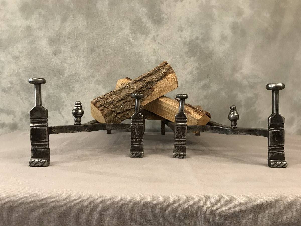 Paire de chenets en fer poli, avec double ferrure sur les parties arrières, ils sont d'époque 18ème à décor de trois toupies en façade.