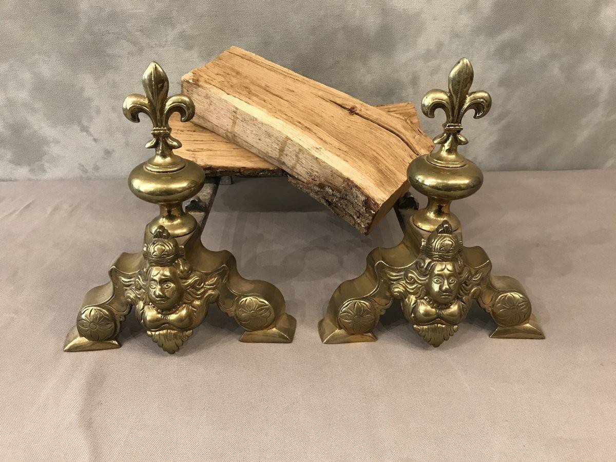 Paire de chenets ancien en laiton d'époque 19ème modèle aux marmousets surmontés d'une fleur de lys.