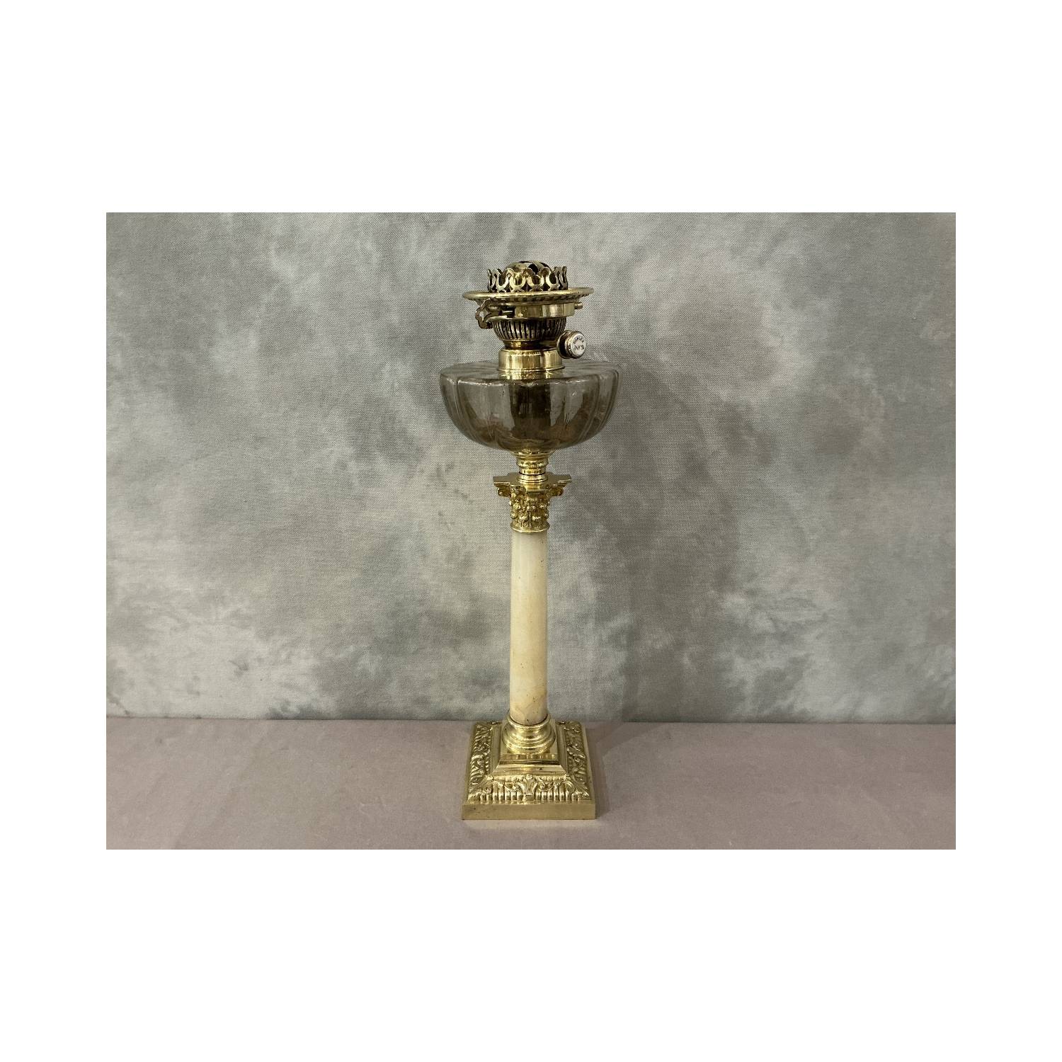 Pied de lampe à pétrole en bronze et albâtre d'époque 19 ème de style Louis XVI, les parties en bronze sont entièrement poli et vernis.