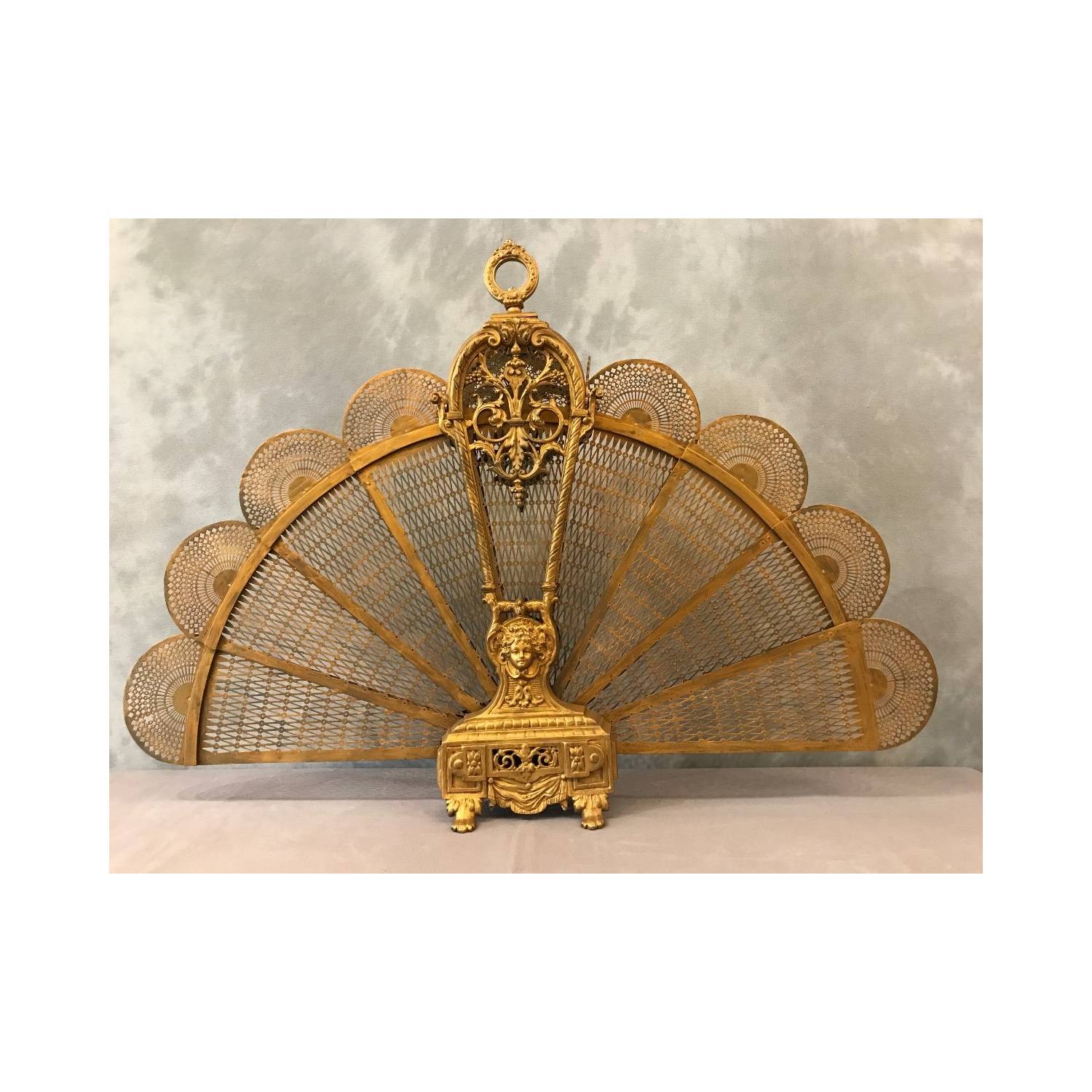 Pare feu de cheminée ancien en éventail en bronze peint en doré, il est d'époque 19 ème de style Louis XVI et s'ouvre en queue de paon.