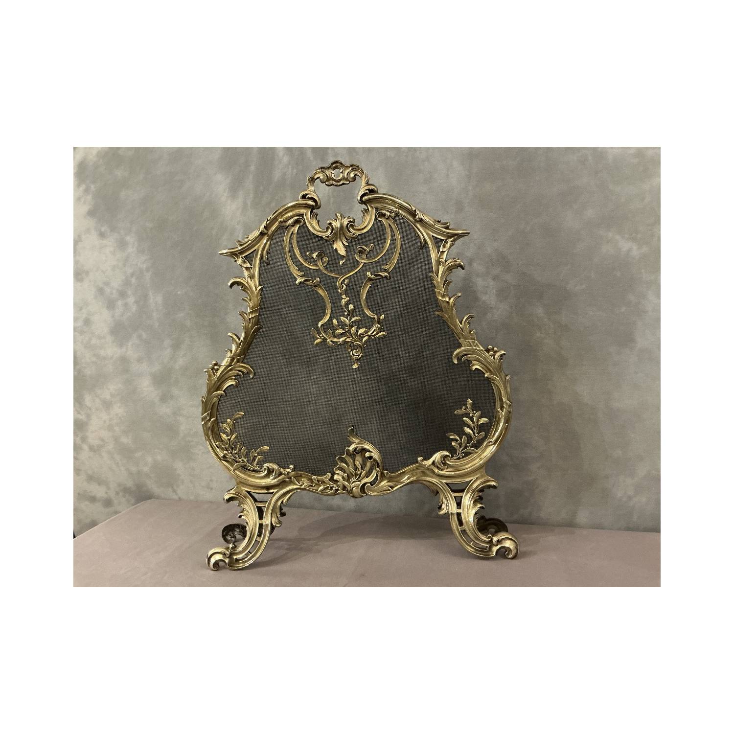Pare feu écran de cheminée en bronze entièrement poli et vernis d'époque 19 ème de style Louis XV à décor de feuillages, modèle très décoratif de petite taille.