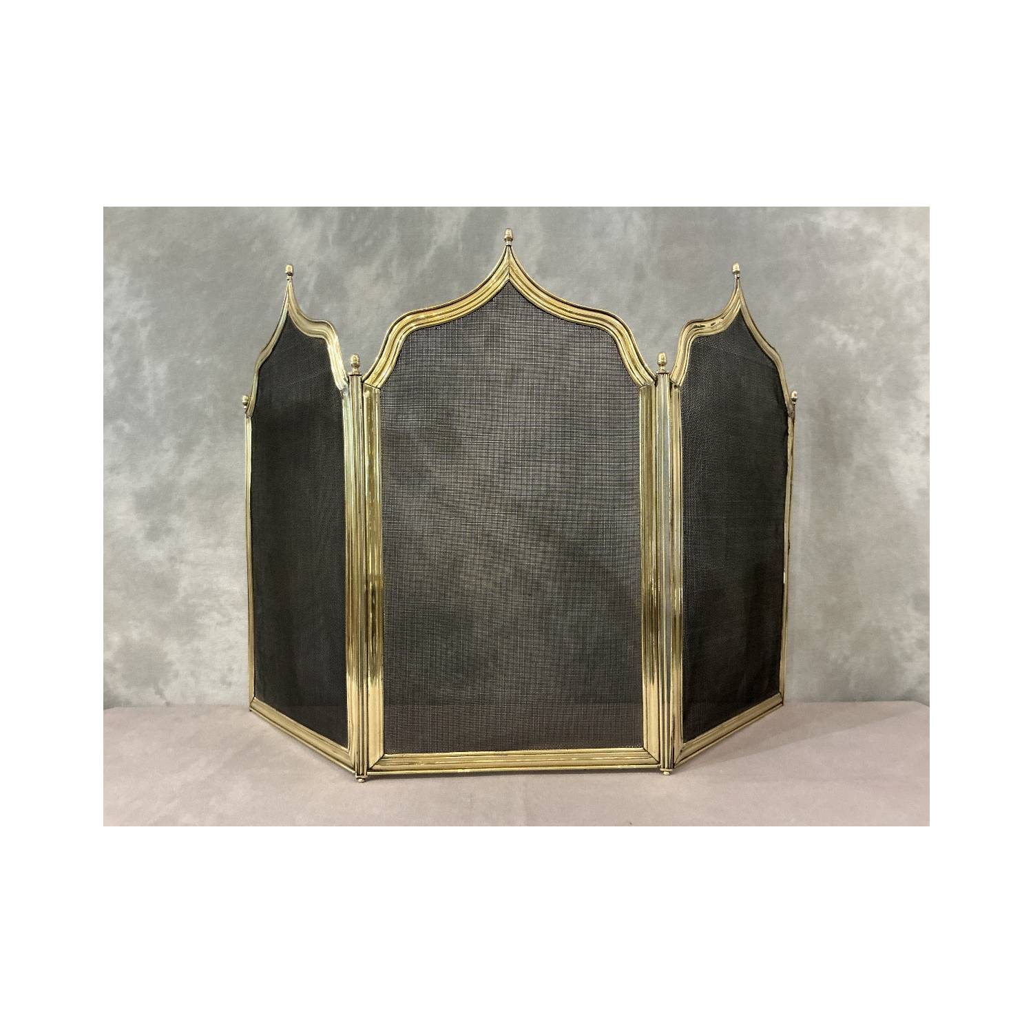 Petit pare feu de cheminée ancien en laiton entièrement poli et vernis d'époque 19 ème Charles X, de forme gothique, il a été restauré (un bord de laiton restauré mais n'empèche pas son efficacité) les pointes sont à décor de glands.