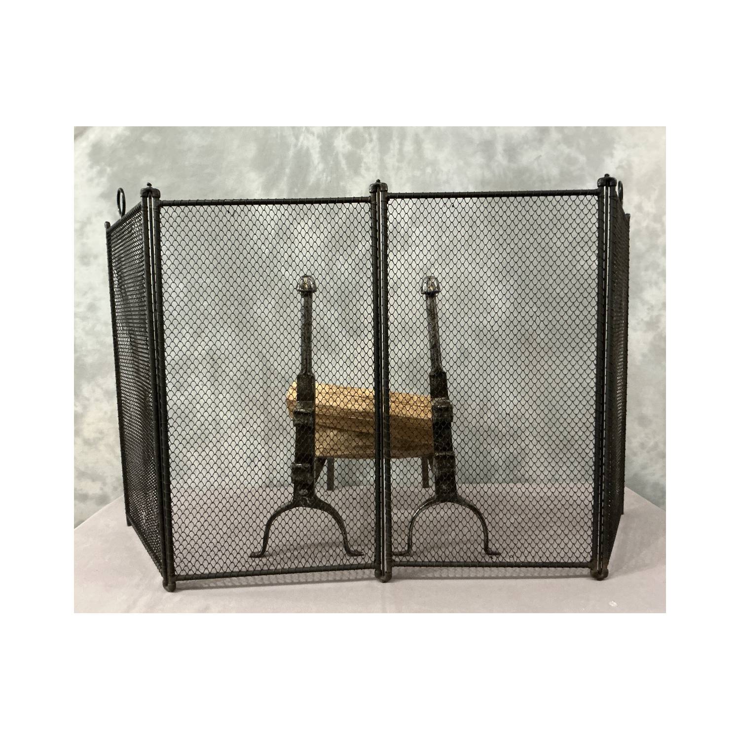Pare feu de cheminée ancien rustique en fer d'époque 19 ème, il s'ouvre à 4 panneaux égaux et porte deux petites poignées en forme d'anneau.