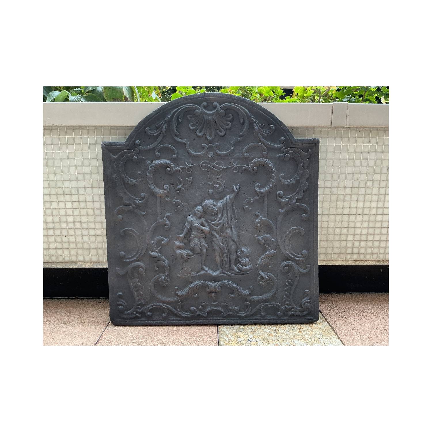 Plaque de cheminée ancienne en fonte noircie d'époque 18 ème au décor de feuillages, de personnages et d'une belle coquille sur le haut du fronton. Dimensions largeur 75 cm hauteur 65/81 cm