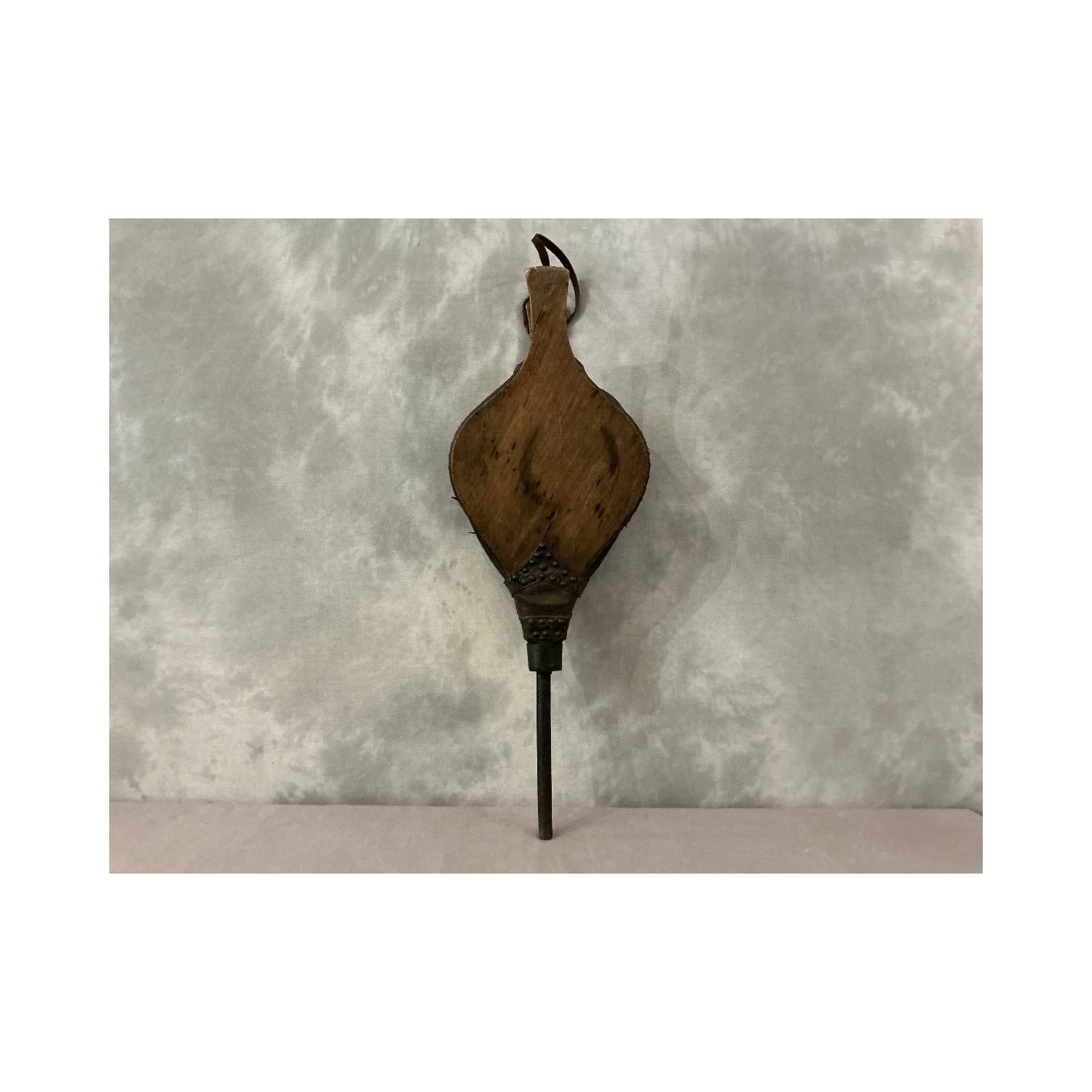Gros soufflet de cheminéeancien en bois rustique d'époque fin 18 ème il porte un grand embout en métal, son cuir est en bon état et il est en état de fonctionnement.